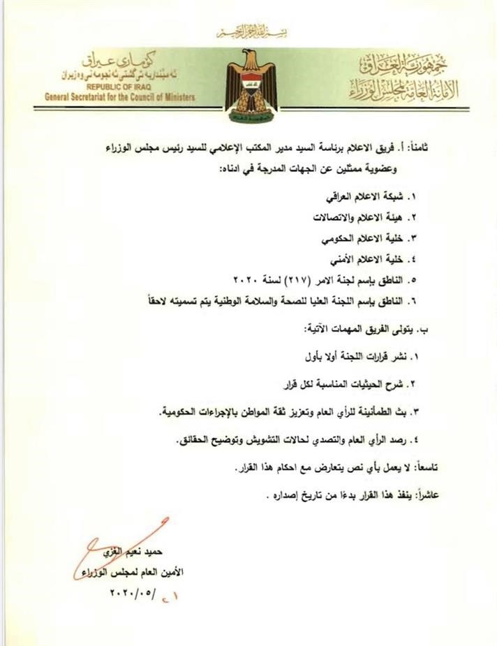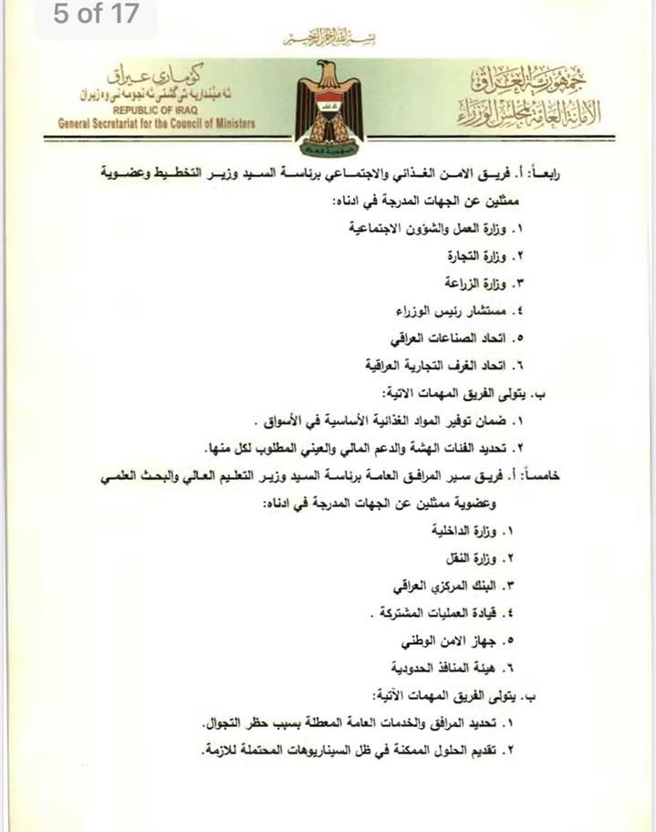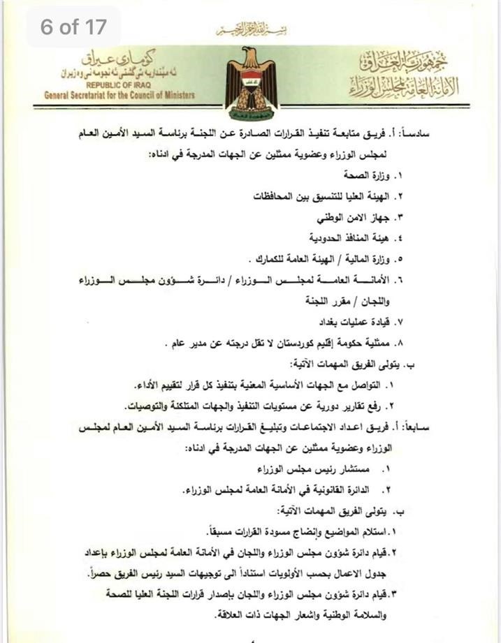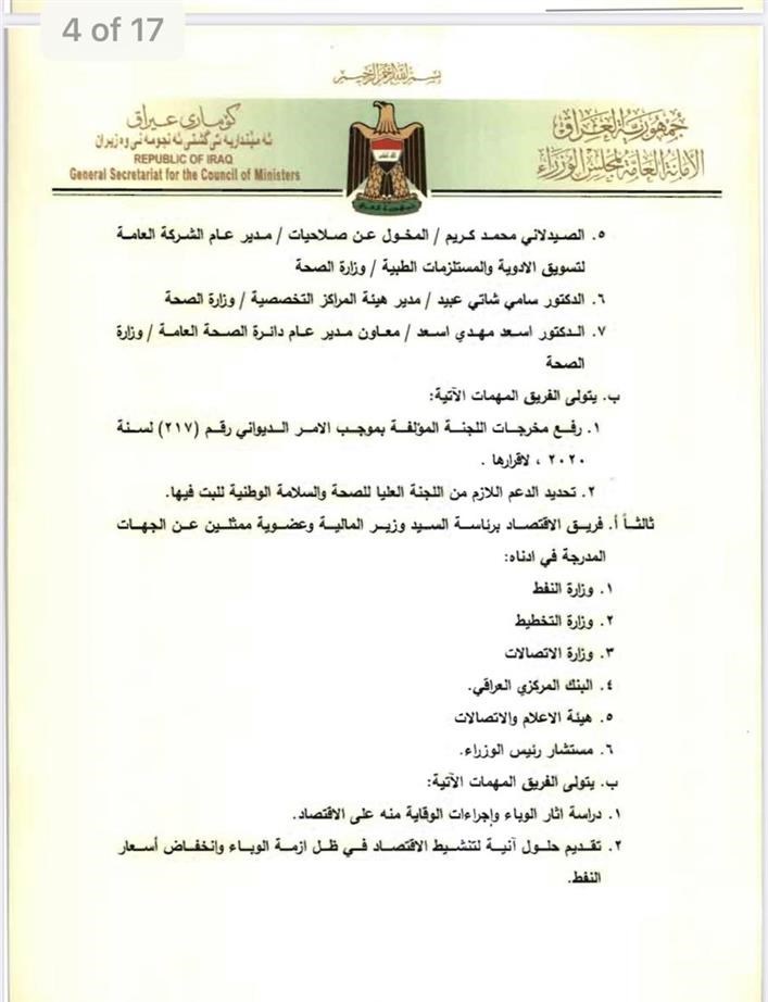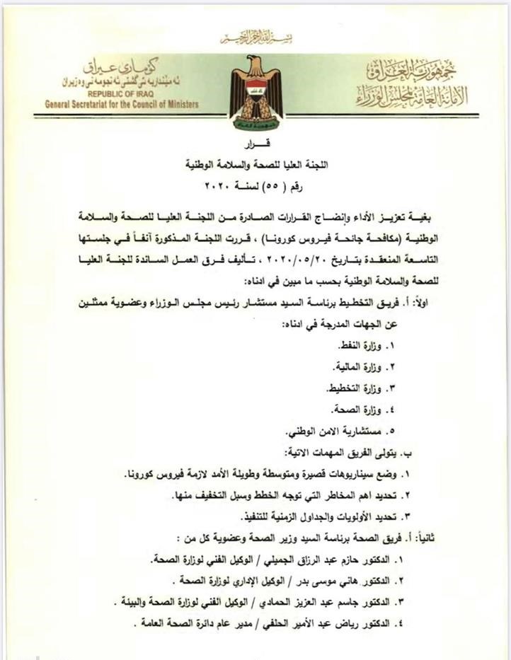 بغداد- العراق اليوم: أصدرت اللجنة العليا للصحة والسلامة الخاصة بمكافحة جائحة كورونا، 9 قرارات لتشكيل فرق عمل ساندة للجنة في مكافحة الوباء. ونصت الوثائق الصادرة من اللجنة والتي تضمنت 9 قرارات خاصة بتأليف فرق العمل الساندة للجنة العليا للصحة والسلامة الوطنية، وتتولى هذه الفرق تحديد اهم المخاطر لمكافحة كورونا والاولويات والجداول الزمنية لتنفيذ الخطط. ادناه نص الوثائق: