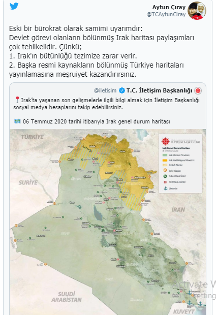بغداد- العراق اليوم: نشرت مديرية الاتصالات بالرئاسة التركية على حسابها تويتر خريطة أظهرت من خلالها “الوضع العام في العراق حتى 6 يوليو 2020″، الأمر الذي أثار حفيظة نائب معارض. وحذر أيتون تشيراي، النائب بحزب الخير، ورئيس لجنة سياسات الأمن الوطني به، من خطورة الإجراء، مشيرا إلى أن نشر رئاسة الاتصالات خريطة مقسمة للعراق، من شأنها أن تعطي شرعية لجهات رسمية في دول أخرى، لنشر خرائط مماثلة لتركيا ذاتها. وشدد تشيراي في تغريدة على حسابه في “تويتر” على أن نشر خريطة مقسمة للعراق يتعارض مع موقف تركيا المعلن عن تمسكها بوحدة الأراضي العراقية. ورأى السياسي التركي المعارض أن نشر جهة رسمية مثل هذه الخريطة، أمر في غاية الخطورة. وذكرت وسائل إعلام تركية أن مديرية الاتصالات بالرئاسية التركية نشرت خريطة للعراق أظهرت من خلالها المواقع التي تتمركز بها القوات التركية في شمال العراق حتى تاريخه، إضافة إلى مواقع حزب العمال الكردستاني