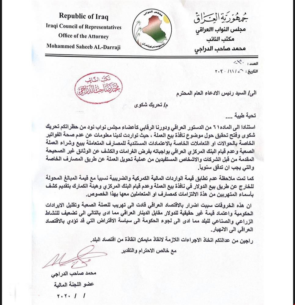 بغداد- العراق اليوم: تقدم عضو اللجنة المالية النيابية، محمد صاحب الدراجي، بشكوى لدى الادعاء العام ضد مزاد العملة، متهماً إياه بالتسبب بخروج العملة الصعبة من داخل البلاد، وإسهامها بالأزمة المالية الحالية. والدراجي هو نائب في المالية النيابية، ووزير سابق، وهو ايضاً صديق النائب محمد شياع السوداني الذي يخوض بدوره ’’معركة قضائية’’ ضد شركات الهاتف النقال، حيث تمكن مؤخراً من إيقاف تجديد تراخيصها للعمل في العراق. وجاء في وثيقة حصل (العراق اليوم) على نسخة منها، أن "معلومات وردت حول عدم صحة الفواتير الخاصة بالحوالات أو الاعتمادات الخاصة". ويذكر الدراجي، عبر تويتر، أن الشكوى تأتي "حفاظا على الاقتصاد العراقي". ويضيف: "بعد خمسة اعوام من المحاولات الحثيثة تنفيذياً وتشريعياً ورقابياً لوقف نزيف العملة اضطررنا للجوء الى الملجأ الاخير وهو القضاء العراقي حيث تقدمنا بشكوى على الهدر الحاصل في نزيف العملة".