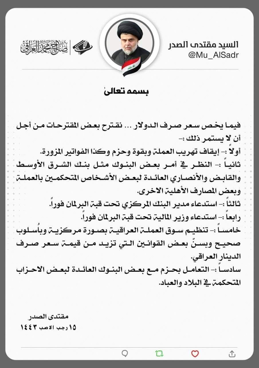 قدم زعيم التيار الصدري، مقتدى الصدر، يوم الخميس، ست مقترحات بشأن سعر صرف الدولار مقابل الدينار العراقي، من بينها استدعاء وزير المالية علي علاوي، ومحافظ البنك المركزي مصطفى غالب بشكل فوري. وتضمنت مقترحات الصدر، بحسب بيان "إيقاف تهريب العملة بقوة، والنظر في أمر بعض البنوك مثل (الشرق الأوسط، القابض، والأنصاري) العائدة لبعض الأشخاص المتحكمين بالعملة، وغيرها من المصارف الأهلية الأخرى، والتعامل بحزم مع البنوك العائدة لبعض الأحزاب المتحكمة في البلاد والعباد". وإضافة إلى ذلك، حث الصدر على "تنظيم سوق العملة العراقية بصورة مركزية وبأسلوب صحيح، عبر سن بعض القوانين التي تزيد من قيمة سعر صرف الدينار". وكان الصدر، قد دعا أمس الأربعاء، إلى تجنيب العراقيين أضرار الفائدة المتحققة من ارتفاع أسعار صرف الدولار في البلاد. وكتب الصدر في تدوينة له على تويتر، أن "ارتفاع سعر صرف الدولار، وما فيه من فوائد وأضرار، يجب ألّا يتسبب على الإطلاق بارتفاع أسعار السلع في الأسواق ولا سيما المهمة منها". وشدد على ضرورة العمل من خلال الأمن الاقتصادي، لمعاقبة كل من يسعى لذلك من التجار، وما شاكل ذلك ووفق القانون، خصوصاً في الشعب مقبل على شهر رمضان".