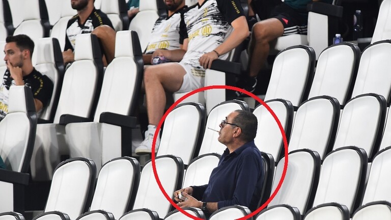 والتقطت الكاميرات المدرب الإيطالي أثناء تدخينه سيجارة في قلب مدرجات ملعب أليانز خلال الشوط الأول من المباراة.