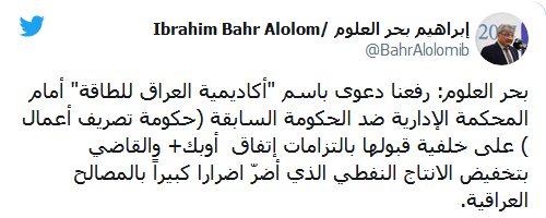 بغداد- العراق اليوم: أعلن وزير النفط والنائب العراقي الأسبق، إبراهيم بحر العلوم،رفع دعوى ضد الحكومة العراقية السابقة، على خلفية قبولها بتخفيض الانتاج النفطي. وقال بحر العلوم في تغريدة بموقع تويتر إنه تم رفع دعوى باسم “أكاديمية العراق للطاقة” أمام المحكمة الإدارية ضد حكومة عادل عبدالمهدي السابقة “حكومة تصريف أعمال” على خلفية قبولها بالتزامات إتفاق أوبك +، والقاضي بتخفيض الانتاج النفطي، الذي “أضرّ اضراراً كبيراً بالمصالح العراقية”. وبسبب جائحة كورونا انخفض سعر النفط العالمي جراء وفرة العرض وقلة الطلب ماتسبب بأزمة في الدول التي يعتمد اقتصادها على النفط.