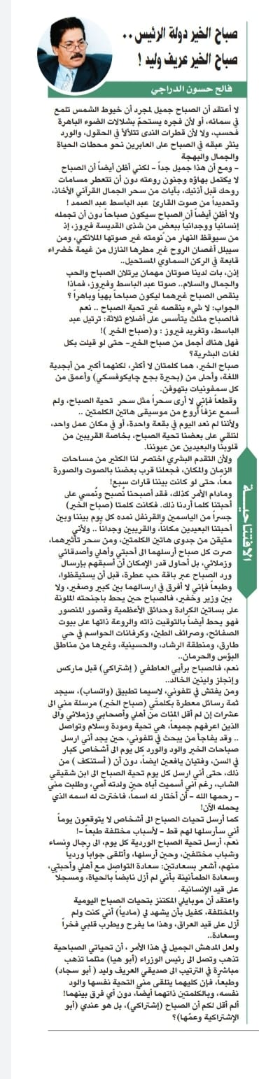 بغداد- العراق اليوم: فالح حسون الدراجي افتتاحية جريدة الحقيقة لا أعتقد أن الصباح جميل لمجرد أن خيوط الشمس تلمع في سمائه، أو لأن فجره يستحم بشلالات الضوء الباهرة فحسب، ولا لأن قطرات الندى تتلألأ في الحقول، والورد ينثر عبقه في الصباح على العابرين نحو محطات الحياة والجمال والبهجة - ومع أنّ هذا جميل جداً - لكني أظن أيضاً أن الصباح لا يكتمل بهاؤه وجنون روعته دون أن تتعطر مسامات روحك قبل أذنيك، بآيات من سحر الجمال القرآني الأخاذ، وتحديداً من صوت القارئ عبد الباسط عبد الصمد ! ولا أظن أيضاً أن الصباح سيكون صباحاً دون أن تجمله إنسانياً ووجدانياً ببعضٍ من شذى القديسة فيروز، إذ من سيوقظ النهار من نومته غير صوتها الملائكي، ومن سيبلل أغصان الروح غير مطرها النازل من غيمة خضراء قابعة في الركن السماوي المستحيل؟.. إذن، بات لدينا صوتان مهمان يرتلان الصباح والحب والجمال والسلام.. صوتا عبد الباسط وفيروز، فماذا ينقص الصباح غيرهما ليكون صباحاً بهياً وباهراً ؟ الجواب: لا شيء ينقصه غير تحية الصباح .. نعم، فالصباح مثلث يتأسس على أضلاع ثلاثة: ترتيل عبد الباسط، وتغريد فيروز : و(صباح الخير )! فهل هناك أجمل من صباح الخير- حتى لو قيلت بكل لغات البشرية؟ صباح الخير، هما كلمتان لا أكثر، لكنهما أكبر من أبجدية اللغة، وأحلى من (بحيرة بجع چايكوفسكي) وأعمق من كل سمفونيات بتهوفن. وقطعاً فإني لا أرى سحراً مثل سحر تحية الصباح، ولم أسمع عزفاً أروع من موسيقى هاتين الكلمتين .. ولأننا لم نعد اليوم في بقعة واحدة، أو في مكان عمل واحد، لنلقي على بعضنا تحية الصباح، بخاصة القريبين من قلوبنا والبعيدين عن عيوننا. ولأن التقدم البشري اختصر لنا الكثير من مساحات الزمان والمكان، فجعلنا قرب بعضنا بالصوت والصورة معاً، حتى لو كانت بيننا قارات سبع! ومادام الأمر كذلك، فقد أصبحنا نصبح ونمسي على أحبتنا كلما أردنا ذلك. فكانت كلمتا (صباح الخير) جسراً من الياسمين والقرنفل نمده كل يوم بيننا وبين أحبتنا البعيدين مكاناً، والقريبين وجداناً .. ولأني متيقن من جدوى هاتين الكلمتين، ومن سحر تأثيرهما، صرت كل صباح أرسلهما الى أحبتي وأهلي وأصدقائي وزملائي، بل أحاول قدر الإمكان أن أسبقهم بإرسال ورد الصباح عبر باقة حب عطرة، قبل أن يستيقظوا، وطبعاً فإني لا أفرق في ارسالهما بين كبير وصغير، ولا بين وزير وخفير، فالصباح حين يحط باجنحته الملونة على بساتين الكرادة وحدائق الأعظمية وقصور المنصور فهو يحط أيضاً بالتوقيت ذاته والروعة ذاتها على بيوت الصفائح، وصرائف الطين، وكرفانات الحواسم في حي طارق، ومنطقة الرشاد، والحسينية، وغيرها من مناطق البؤس والحرمان.. نعم، فالصباح برأيي العاطفي ( إشتراكي) قبل ماركس وإنجلز ولينين الخالد.. ومن يفتش في تلفوني، لاسيما تطبيق (واتساب)، سيجد ثمة رسائل معطرة بكلمتي (صباح الخير) مرسلة مني الى عشرات إن لم أقل المئات من أهلي وأصحابي وزملائي والى الذين اعرفهم جميعاً، هي تحية ومودة وسلام وتواصل .. وقد يفاجأ من يبحث في تلفوني، حين يجد اني ارسل صباحات الخير والود والورد كل يوم الى أشخاص كبار في السن، وفتيان يافعين ايضاً، دون أن ( أستنكف ) من ذلك، حتى اني ارسل كل يوم تحية الصباح الى ابن شقيقي الشاب، رغم اني أسميت أباه حين ولدته أمي، وطلبت مني - رحمها الله - أن أختار له اسماً، فاخترت له اسمه الذي يحمله الآن! كما أرسل تحيات الصباح الى أشخاص لا يتوقعون يوماً أني سأرسلها لهم قط - لأسباب مختلفة طبعاً -! نعم، أرسل تحية الصباح الوردية كل يوم، الى رجال ونساء وشباب مختلفين، وحين أرسلها، وأتلقى جواباً وردياً منهم، أشعر بسعادتين: سعادة التواصل مع أهلي وأحبتي، وسعادة الطمأنينة باني لم أزل نابضاً بالحياة، ومسجلاً على قيد الإنسانية. واعتقد ان موبايلي المكتنز بتحيات الصباح اليومية والمختلفة، كفيل بأن يشهد لي (مادياً) أني كنت ولم أزل على قيد العراق، وهذا ما يفرح ويطرب قلبي فخراً وسعادة.. ولعل المدهش الجميل في هذا الأمر، أن تحياتي الصباحية تذهب وت