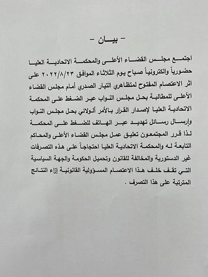 بغداد- العراق اليوم: بيان هام صادر عن مجلس القضاء الأعلى : اجتمع مجلس القضاء الاعلى والمحكمة الاتحادية العليا حضوريا والكترونياً صباح يوم الثلاثاء الموافق 23 /8 /2022 على اثر الاعتصام المفتوح لمتظاهري التيار الصدري امام مجلس القضاء الاعلى للمطالبة بحل مجلس النواب عبر الضغط على المحكمة الاتحادية العليا لاصدار القرار بالامر الولائي بحل مجلس النواب وارسال رسائل تهديد عبر الهاتف للضغط على المحكمة لذا قرر المجتمعون تعليق عمل مجلس القضاء الاعلى والمحاكم التابعة له والمحكمة الاتحادية العليا احتجاجا على هذه التصرفات غير الدستورية والمخالفة للقانون وتحميل الحكومة والجهة السياسية التي تقف خلف هذا الاعتصام المسؤولية القانونية ازاء النتائج المترتبة على هذا التصرف.