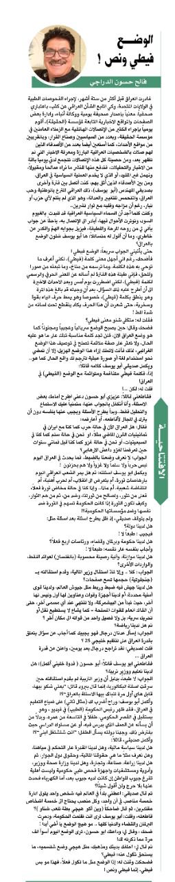 ولم يتوقف صديقي، إذ ظل يطرح اسئلة بعد اسئلة مثل: هل لدينا دولة؟ فيجيب :،طبعاً لا ! هل لدينا حكومة وبرلمان وقضاء، ورئاسات اربع فعلاً؟ وأجاب بنفسه على نفسه: طبعاً لا ! هل لدينا موازنة، وآلية رصينة محسوبة (بالفلسان) لعوائد النفط، والواردات الأخرى؟ الجواب : كلا .. وإلاٌ لماذ استقال وزير المالية، وقدم استقالته ب (جنجلوتية) حجمها تسع صفحات؟ هل لدينا جيش فيه ضبط وربط مثل جيوش العالم، ولدينا قوى أمنية محددة، أم لدينا أجهزة وقوات وعناوين لها أول وليس لها آخر، حيث تبدأ من البيشمرگة، ولا تنتهي عند أي مسمى آخر، حتى أن القائد العام للقوات المسلحة - كما يشاع لا يستطيع نقل أو تحريك سرية، بل ولا فصيل واحد من قواته الى مكان آخر ؟ ثم هل لدينا رياضة؟ الجواب: إسأل عدنان درجال فهو يجيبك كما أجاب عن سؤال يتعلق بقدرة العراق على تنظيم خليجي 25 ؟ قلت لصديقي: لقد تراجع درچال بعد يومين، واعلن عن قدرة العراق ... فقاطعني ابو يوسف قائلاً: أبو حسون ( فدوة خليني أكمل): هل لدينا تعليم ووزير تربية؟ الجواب: لا طبعاً، بدليل أن وزير التربية لم يقدم استقالته حين سرقت اسئلة البكالوريا، إنما قال ببرود قاتل: “يعني شكو بيها، قابل هاي أول مرة تنباگ بيها الاسئلة بالعراق”؟! وأكمل أبو يوسف: وراح أضرب لك (مثال ثاني) على ضياع التعليم في العراق، فقد ظهر رئيس الحكومة (الطيب) في فيديو ، وهو يستقبل في القصر الحكومي، طفلاً في التاسعة من عمره، وبدلاً من أن يسأله عن الصف الذي يدرس فيه، أو عن مستواه الدراسي حيث يفترض ذلك، وجدنا دولته يسأل الطفل: “إنت شتشتغل إبني”؟! وأكمل صديقي، قائلاً: هل لدينا سياسة مائية، وهل لدينا القدرة على التحكم في مياهنا، وهل نعرف مثلاً ما هي حقوقنا المائية، وحقوق دول الجوار، ثم هل لدينا زراعة، صناعة، وتجارة، وهل لدينا وزارة صحة ووزير، وأدوية ومستشفيات واجهزة فحص طبي حكومية وليست أهلية تفرغ جيوب المواطن إن كانت لديه جيوب بعد، أما الكهرباء فحدث عنها بلا حرج ولن أقول شيئاً؟ ثم قال صديقي: اعطني بلداً في العالم فيه شخص واحد يتولى ادارة خمسة مناصب في آن واحد، وكل منصب يحتاج الى خمسة اشخاص مقتدرين، ثم قال ضاحكاً (وين أكو هيچي بطة تلعب شناو )؟ قاطعته، وقلت: أبو يوسف ترى إنت ظلمت الحكومة، ودمرت البرلمان والقضاء والدنيا كلها .. مو هيچ الوضع يا أخي أبداً ! ضحك ، وقال لي: وداعتك ابو حسون، ترى الوضع اليوم أسوأ الف مرة مما ذكرته لك! ثم قال لي: احلفك بدينك ومذهبك، مثل هيچي وضع شتسميه، ما يستحق تگول عنه: فيطي؟ فضحكت وقلت له: إذا الوضع مثل ما تگول فعلاً، فهذا مو بس فيطي، إنما فيطي ونص !