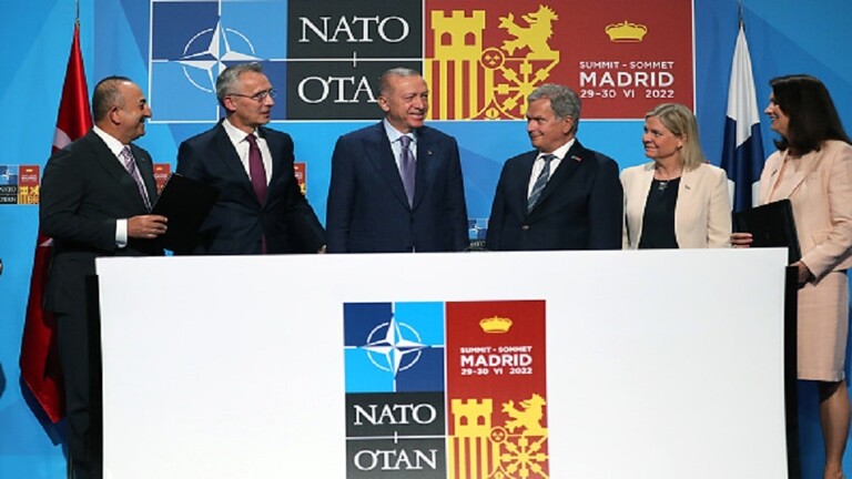 ووقعت تركيا والسويد وفنلندا، في 28 يوليو، مذكرة تفاهم ثلاثية بشأن عضوية البلدين الأخيرين في حلف شمال الأطلسي الناتو، بعد تعهد البلدين بتبديد مخاوف تركيا الأمنية وتعهدهما بالتعاون معها في مكافحة "الإرهاب".
