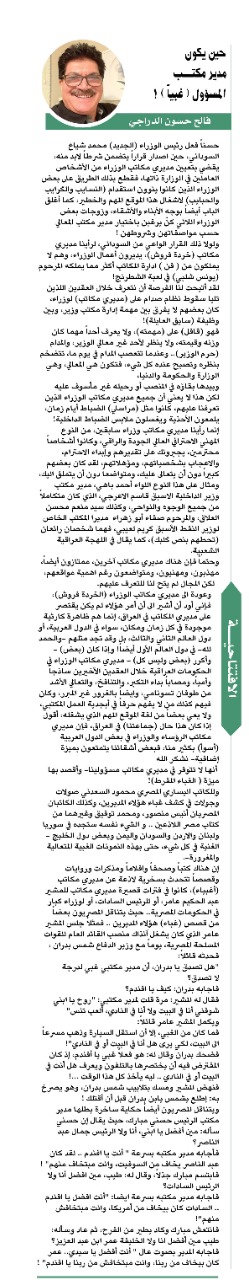 حسناً فعل رئيس الوزراء (الجديد) محمد شياع السوداني، حين اصدر قراراً يتضمن شرطاً لابد منه، يقضي بتعيين مديري مكاتب الوزراء من الأشخاص العاملين في الوزارة ذاتها، فقطع بذلك الطريق على بعض الوزراء الذين كانوا ينوون استقدام (النسايب والگرايب والحبايب) لاشغال هذا الموقع المهم والخطير، كما أغلق الباب أيضاً بوجه الأبناء والأشقاء، وزوجات بعض الوزراء اللائي كنّ يرغبن باختيار مدير مكتب المعالي حسب مواصفاتهن وشروطهن ! ولولا ذلك القرار الواعي من السوداني، لرأينا مديري مكاتب (خردة فروش)، يديرون أعمال الوزراء، وهم لا يملكون من ( فن ) ادارة المكاتب أكثر مما يملكه المرحوم (يونس شلبي) في لعبة الشطرنج! لقد أتيحت لنا الفرصة أن نتعرف خلال العقدين اللذين تليا سقوط نظام صدام على (مديري مكاتب) لوزراء، كان بعضهم لا يفرق بين مهمة إدارة مكتب وزير، وبين وظيفة (سايق العايلة)! فهو (قافل) على (مهمته)، ولا يعرف أحداً مهما كان وزنه وقيمته، ولا ينظر لأحد غير معالي الوزير، والمدام (حرم الوزير).. وعندما تتعصب المدام في يوم ما، تتضخم بنظره وتصبح عنده كل شيء، فتكون هي المعالي، وهي الوزارة والحكومة والدنيا، وبيدها بقاؤه في المنصب أو رحيله غير مأسوف عليه لكن هذا لا يعني أن جميع مديري مكاتب الوزراء الذين تعرفنا عليهم، كانوا مثل (مراسلي) الضباط أيام زمان، يلمعون الأحذية ويغسلون ملابس الضباط الداخلية! إنما رأينا مديري مكاتب وزراء سابقين، من النوع المهني الاحترافي العالي الجودة والراقي، وكانوا أشخاصاً محترمين، يجبرونك على تقديرهم وإبداء الاحترام، والاعجاب بشخصياتهم، ومؤهلاتهم، لقد كان بعضهم كبيراً دون أن يتعالى عليك، ومتواضعاً دون أن يتملق اليك، ومثال على هذا النوع اللواء أحمد باهي، مدير مكتب وزير الداخلية الاسبق قاسم الاعرجي، الذي كان متكاملاً من جميع الوجوه والنواحي، وكذلك سيد منعم محسن العلاق، والمرحوم صفاء أبو زهراء مديرا المكتب الخاص لوزير النفط الأسبق كريم لعيبي، فهما شخصان رائعان (تحطهم بنص گلبك)، كما يقال في اللهجة العراقية الشعبية. وحتماً فإن هناك مديري مكاتب آخرين، ممتازون أيضاً، مهذبون، ومهنيون، ومتواضعون رغم اهمية مواقعهم، لكن المجال لم يتح لنا للتعرف عليهم. وعودة الى مديري مكاتب الوزراء (الخردة فروش)، فإني أود أن أشير الى أن أمر هؤلاء لم يكن يقتصر على مديري المكاتب في العراق، إنما هم ظاهرة كارثية موجودة في كل زمان ومكان، سواء في الدول العربية، أو دول العالم الثاني والثالث، بل وقد تجد مثلهم -والحمد لله- في دول العالم الأول أيضاً! وإذا كان (بعض) - وأكرر (بعض وليس كل) - مديري مكاتب الوزراء في الحكومات العراقية خلال العقدين الأخيرين ساذجاً وأمياً، ومصاباً بداء التكبر، والتنافخ، والتعالي الأشد من طوفان تسونامي، وايضاً بالغرور غير المبرر، وكان فيهم كذلك من لا يفهم حرفاً في أبجدية العمل المكتبي، ولا يعي بعضاً من لغة الموقع المهم الذي يشغله، أقول إذا كان هذا حال (جماعتنا) في العراق، فإن مديري مكاتب الرؤساء والوزراء في بعض الدول العربية (أسوأ) بكثير منا، فبعض أشقائنا يتمتعون بميزة إضافية- نشكر الله أنها لا تتوفر في مديري مكاتب مسؤولينا- وأقصد بها ميزة ( الغباء المفرط)! وللكاتب اليساري المصري محمود السعدني صولات وجولات في كشف غباء هؤلاء المديرين، وكذلك الكاتبان المصريان أنيس منصور، ومحمد توفيق وغيرهما من كتاب مصر اللاذعين .. و الشيء نفسه ستجده في سوريا ولبنان والاردن والسودان واليمن وبعض دول الخليج - الغنية في كل شيء، حتى بهذه النمونات الغبية المتعالية والمغرورة-. إن هناك كتباً وصحفاً وافلاماً ومذكرات وروايات وقصصاً تتحدث بسخرية لاذعة عن مديري مكاتب (أغبياء)، كانوا في فترات قصيرة مديري مكاتب للمشير عبد الحكيم عامر، أو للرئيس السادات، أو لوزراء كبار في الحكومات المصرية.. حيث يتناقل المصريون بعضاً من قصص (غباء) هؤلاء المديرين .. فمثلاً جلس المشير عامر الذي كان يشغل آنذاك منصب القائد العام للق
