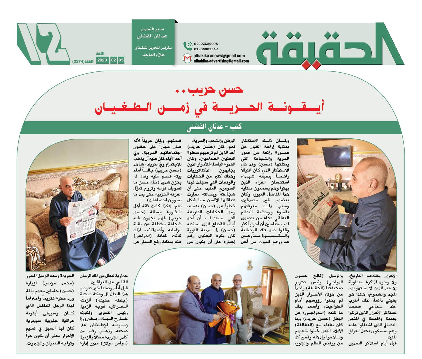 الأحرار يخلدهم التاريخ، ولا وجود لذاكرة معطوبة إلا عند الذين لا يستهويهم المجد والشموخ، هكذا هو يقيني دائماً، لذلك أطرب عند سماعي قصصاً تستذكر الأحرار الذين تركوا بصمة واضحة في المنجز النضالي الذي اشتغلوا عليه وهم يمسكون بحبل العراق المتين. قبل أيام استذكر الصديق والزميل (فالح حسون الدراجي) رئيس تحرير صحيفتنا (الحقيقة) واحداً من هؤلاء الأحرار الذين لم يحنوا رؤوسهم أمام الطواغيت، وأقصد بذلك ما كتبه (الدراجي) عن البطل (حسن حريب) وما كان يفعله مع (العفالقة) الأذلاء الذين خانوا شعبهم وساهموا بإذلاله وقمع كل من يرفض الظلم والجور، وكان ذلك الاستذكار بمثابة إزاحة الغبار عن صورة رائعة من صور الحرية والشجاعة التي يمتلكها (حسن) وقد نال الاستذكار الذي كان انثيالاً رائعاً بصيغة شهادة، استحسان القراء الذين بهتوا وهم يسمعون حكاية هذا المناضل الغيور، وكان بعضهم غير مصدقين، وسبب ذلك معرفتهم بقسوة ووحشية النظام العفلقي تجاه من يتصدى لهم، متناسين أن أحراراً كثر وقفوا ضد تلك الوحشية والقسوة مشرعين صدورهم للموت من أجل الوطن والشعب والحرية. نعم، كان (حسن حريب) أحد الذين لم ترعبهم سطوة البعثيين الصداميين، وكان القدوة الباسلة للأحرار الذين يجابهون الدكتاتوريات وهناك كثير من الحكايات والوقفات التي سجلت لهذا السومري العنيد، حتى أن شجاعته وبسالته صارت تتناقلها الألسن مما شكل خطراً على (حسن) نفسه، ومن الحكايات الظريفة التي سمعتها ، أن أحد أبناء القطاع الذي يسكنه (حسن) في مدينة الثورة كان يكره البعثيين رغم إجباره على أن يكون من ضمنهم، وكان حزيناً لأنه صار مجبراً على حضور اجتماعاتهم الحزبية، وفي أحد الأيام كان عليه أن يذهب للإجتماع وفي طريقه شاهد (حسن حريب) جالساً أمام بيته فسلم عليه وقال له بحزن شديد (خالي حسن ما تسويلك فزعة وتروح تعزّل الفرقة الحزبية حتى بعد ما يسوون اجتماعات). نعم، هكذا كانت ثقة أهل الثورة ببسالة (حسن حريب) فهم يجدون فيه شجاعة مختلفة عن بقية مزامليه وأصدقائه، لذلك كانت كتابة (الدراجي) عنه بمثابة رفع الستار عن جدارية لبطل من ذلك الزمان القاسي على العراقيين. قبل أيام وصلنا خبر تعرض هذا البطل الى وعكة صحية (جلطة خفيفة) ألزمته الفراش، فوجه الزميل رئيس التحرير ولكونه خارج البلاد، بضرورة زيارته للإطمئنان على صحته، وذهب وفد من كادر الجريدة ممثلاً بالزميل (عباس غيلان) مدير إدارة الجريدة ومعه الزميل المحرر (محمد مؤنس) لزيارة (حسن) حاملين معهم باقة ورد عطرة تكريماً واحتراماً لهذا الرجل المناضل الذي كان وسيبقى أيقونة عراقية جنوبية سومرية كان لها السبق في تعليم الأحرار معنى أن تكون حراً وتواجه الطغيان والجبروت.