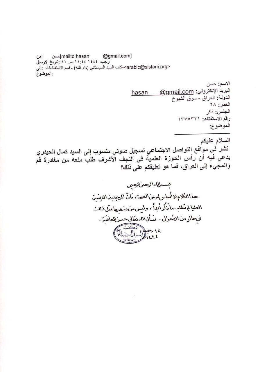 بغداد- العراق اليوم: فند مكتب المرجع الديني الأعلى علي السيستاني، الأحد، الأنباء التي تحدثت عن طلب تقدم به الأخير، لهدف منع المرجع كمال الحيدري من مغادرة "قم" والمجيئ إلى العراق.
